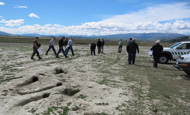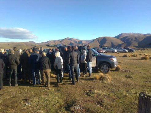 Delegates on the High Country Conference field trip take a break on Dome Hills Station to enjoy a panoramic view of the North Otago coastline and discuss access issues.
